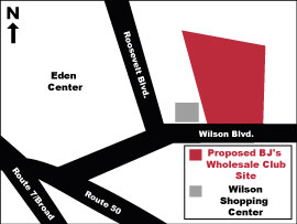 BJ's Wholesale Club has submitted a site plan to build a new store on the 8.6 acre site of the old Noland Oil property at 6607 Wilson Boulevard in the City of Falls Church. The building will occupy 88,000 square feet and contain 366 parking spaces. The City of Falls Church approved the applicant's site plan on April 20th. Planners from Falls Church met with Supervisor Gross to review the site plan and solicit feedback because the development is adjacent to the Seven Corners area of the Mason District in Fairfax County. The most recent project timeline lists a March 2010 opening date. The site is located on the old Noland Oil site at 6607 Wilson Blvd.